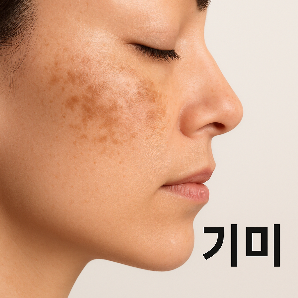 정식 명칭은 "기미성 색소침착(Melasma)" 입니다. 주로 양쪽 광대뼈, 이마, 콧등, 턱 부위에 대칭적으로 나타나며, 만성적으로 지속되는 것이 특징입니다.